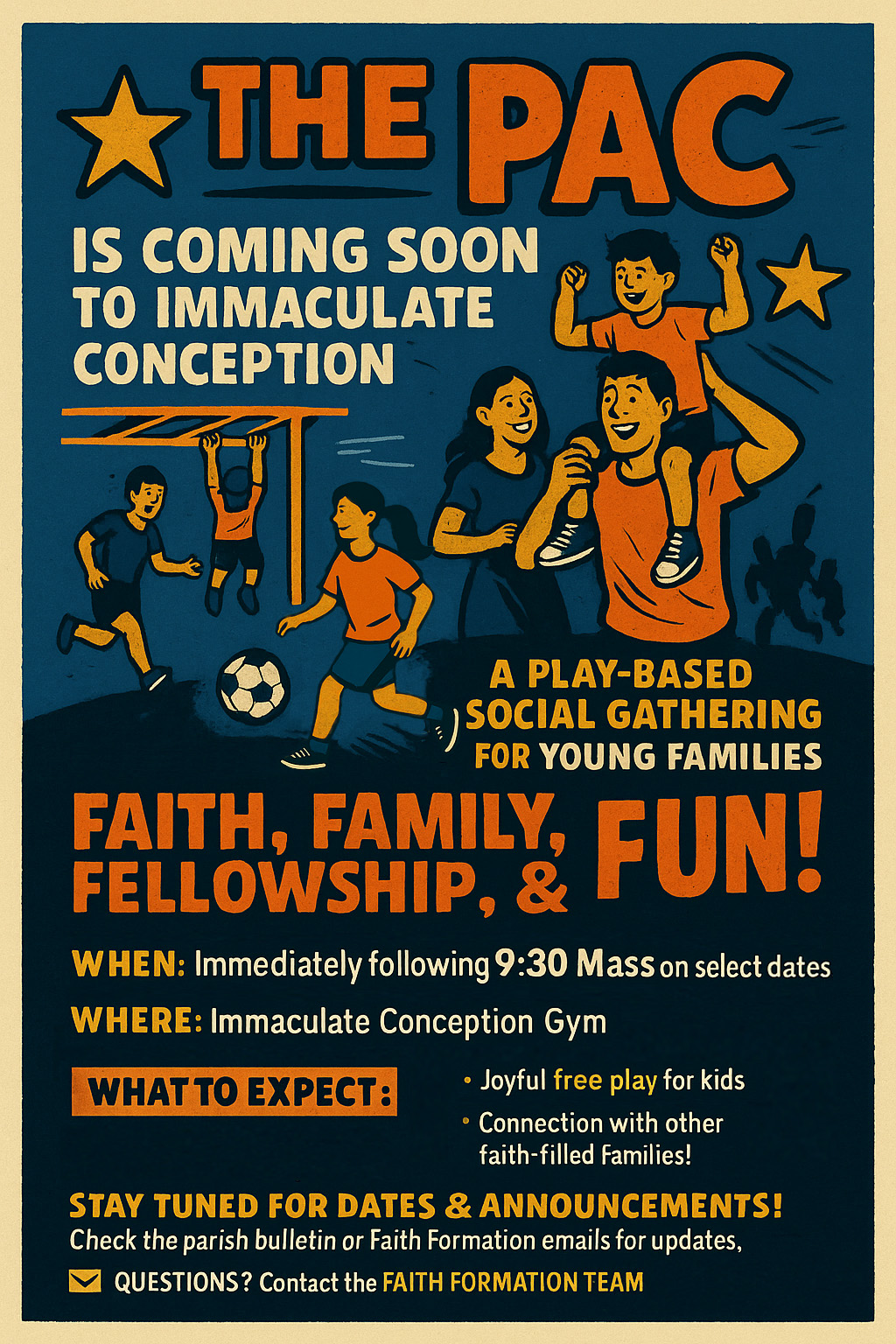 Right after the 9:30 Mass on select Sundays, in the school gym at Immaculate Conception. Kids run, parents talk, families know each other.